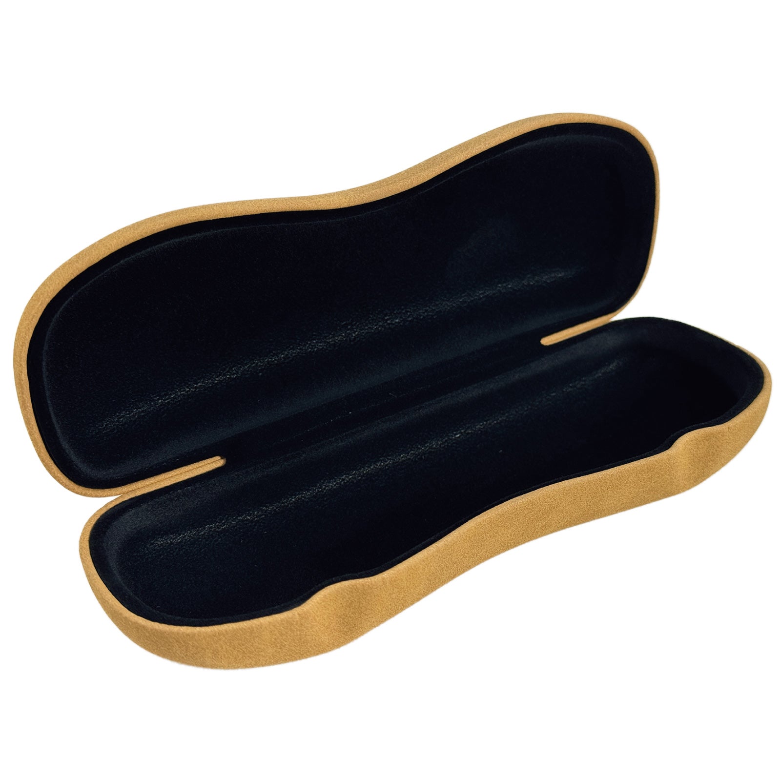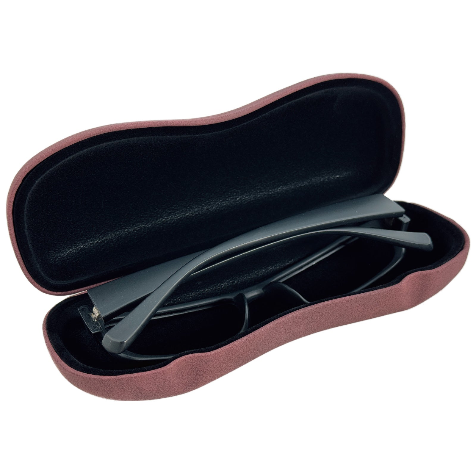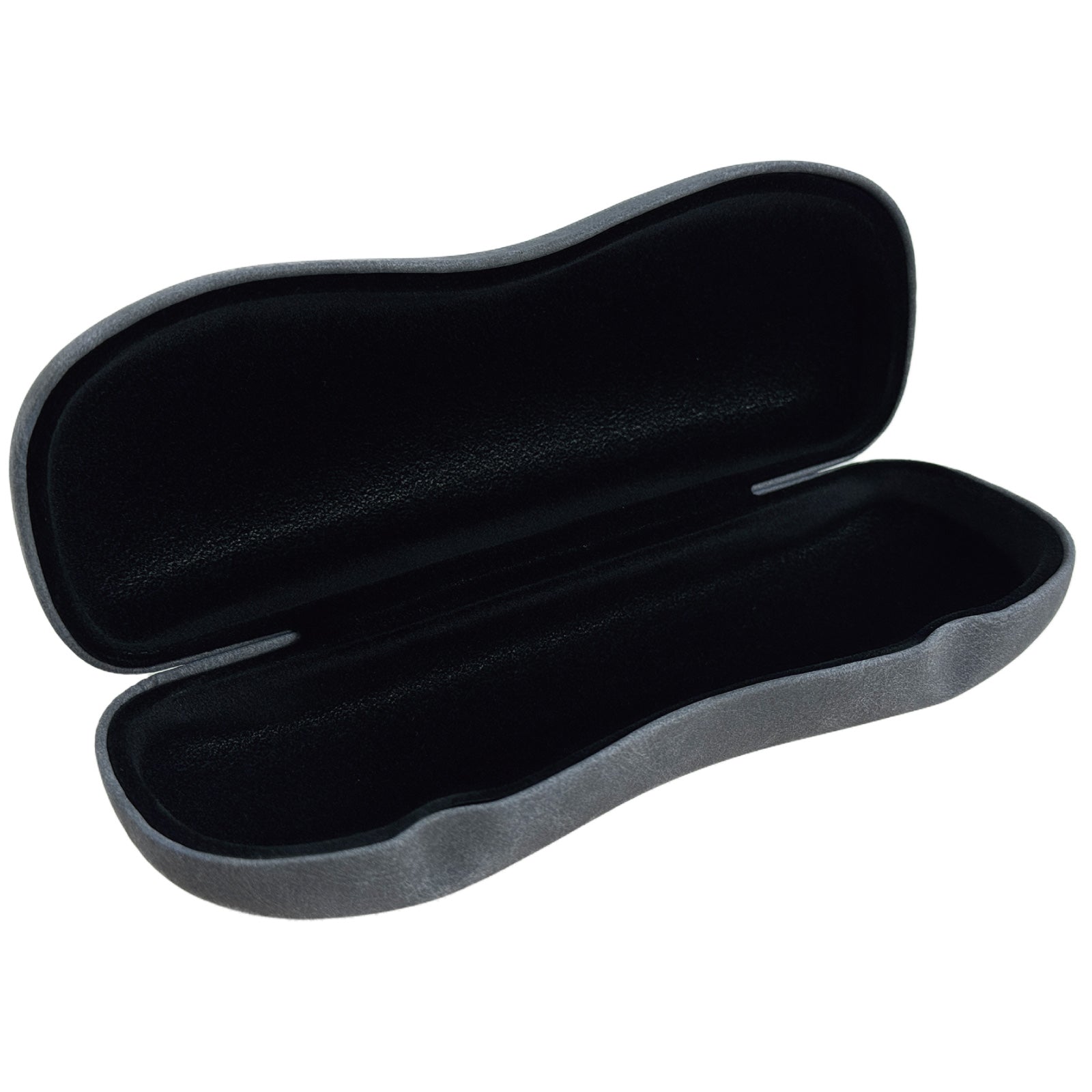 長手のフレームも入る大きさで、ケースにくびれがあり持ちやすく、フタにへこみがついて開けやすい形状のメガネケース(眼鏡ケース)です。