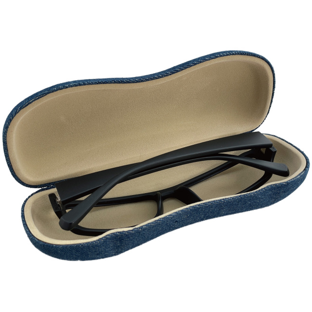 長手のフレームも入る大きさで、ケースにくびれがあり持ちやすく、フタにへこみがついて開けやすい形状のメガネケース(眼鏡ケース)です。